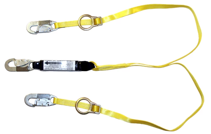 6′ dual leg (100% tie-off), shock absorbing web lanyard w/pack,#74N locking snaps on every end, sliding D-rings on each leg